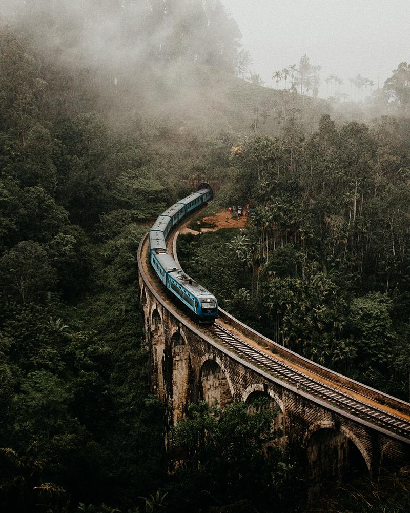The famous Kandy to Ella train passes the Nine Arch Bridge in Sri Lanka.
